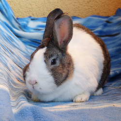 Inzwischen hat sich sein Zustand deutlich verbessert und stabilisiert. Es wird Zeit, dass er sein Kaninchenleben in vollen Zügen genießen darf. Der Umstand, dass er über einen langen Zeitraum häufig Menschen-Besuch für die Medikamentengabe bekam, hat ihn doch erstmal verunsichert. Inzwischen versucht er aber nicht mehr gleich das Weite zu suchen sondern wartet erst mal ab, denn die Wahrscheinlichkeit, dass es was zu essen gibt – ist doch hoch. Er ist ein absolut liebenswerter Kerl! |