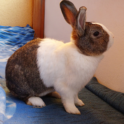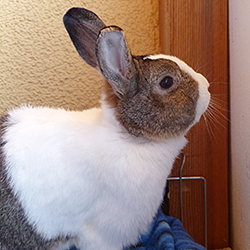 Gesundheit: | Myxomatose und RHD 1+2 geimpft. Die Zähne müssen wir beobachten. Ein Zahn hatte wohl einen Riss und wir können noch nicht sagen, ob er dadurch schief wächst oder ob es sich wieder richtet – geschnitten wurden sie inzwischen einmal beim Tierarzt. |
