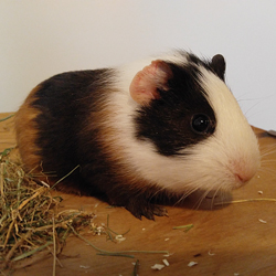 Mia ist sehr neugierig und aufgeschlossen und ist schon dabei, sich an Menschen zu gewöhnen. Sie frisst am liebsten Wiese und Heu, ist aber auch bei Gemüse und Obst nicht abgeneigt. Sie ist verfressen und lässt sich mit Leckereien gut locken. Anderen Meerschweinchen gegenüber steckt sie eher zurück und läuft weg, wenn diese unfreundlich werden. Sie lässt sich aber nicht entmutigen und kommt bald wieder. Mia hat einen alten Bruch am Hinterbein, der ist gut verheilt und sie läuft ganz normal. Ansonsten wächst Mia mit Riesentempo und entwickelt sich sehr gut. |